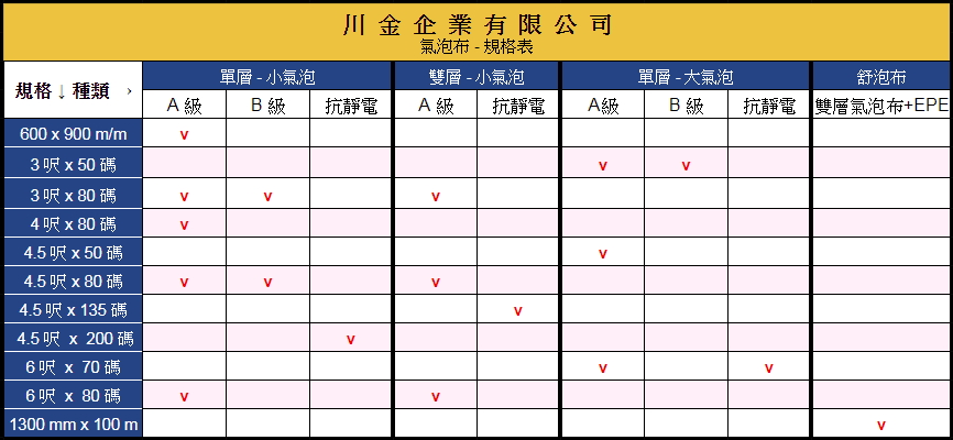 「小」氣泡布 ( 氣泡尺寸10 m/m ) 可分為 : 單層 / 雙層 / 單層抗靜電 / 雙層抗靜電